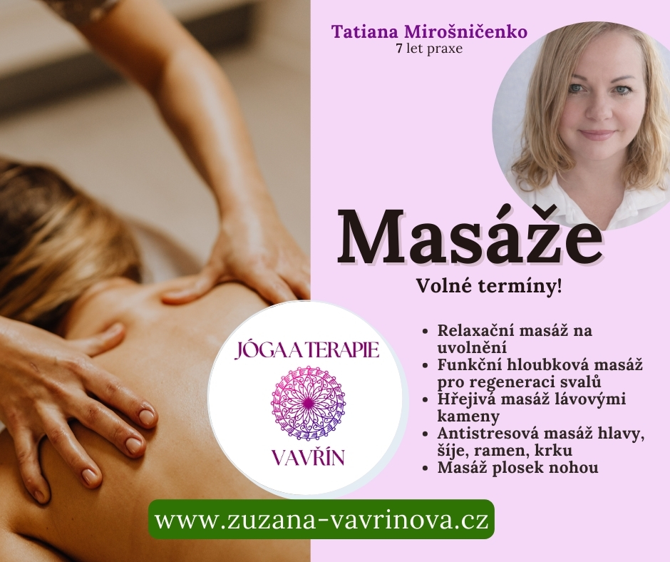 Masáže u nás provádí Tatiana Mirošničenko, která má více než sedm let zkušeností. Je empatická, profesionální a ke každému přistupuje s maximální péčí. Díky svým znalostem a praxi vám dokáže doporučit vhodný typ masáže a nabídnout širokou škálu služeb.